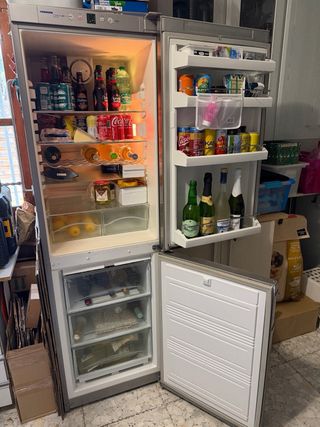 Nevera combi Teka de 188cm de altura con tecnología No Frost. Tiene marcas de uso por el transporte pero funciona genial. La vendo porque nos mudamos. Se puede ver y recoger en entresuelo con ascensor. Rossello con Independencia. - Color: Acero inoxidable. - Puertas: 2. - Tipo: Combi (congelador abajo). - Medidas: 188cm (alto) x 59.5cm (ancho) x 63cm (fondo). - 3 cajones grandes en el congelador