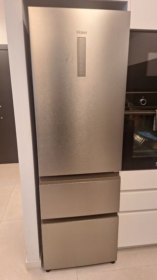Nevera combi Haier con tecnología No Frost. Se encuentra en perfecto estado, como nueva. Se adjunta factura. Comprada hace un año. Casi 2 años de garantía en tienda. Urge vender disponibilidad muy pocos días por mudanza. Recoger en piso Barcelona - Diseño moderno en acero inoxidable. - Cajones inferiores para congelador.