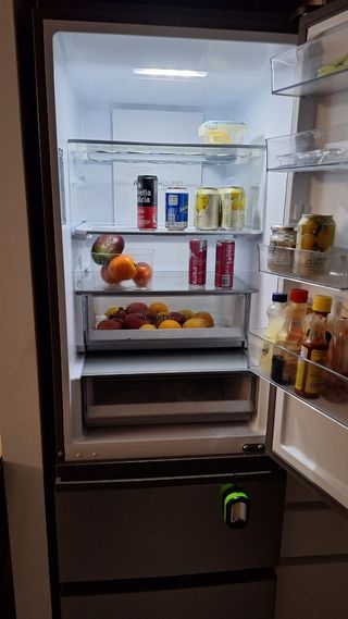 Frigorífico Daewoo de gran capacidad con tecnología No Frost. - Diseño moderno y funcional. - Amplios cajones para verduras y congelados. - Estantes ajustables en la puerta.