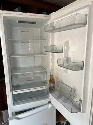 Vendo frigorífico combi de libre instalación en perfecto estado. Es un modelo muy silencioso y con un consumo eléctrico mínimo gracias a su motor inverter. Características principales: Tecnología: Total No Frost (olvídate de descongelar). Capacidad: 330 Litros totales (224L nevera / 106L congelador). Eficiencia: Clase B (ahorro real en la factura de la luz). Interior: 2 cajones FreshBox, 5 bandejas de cristal regulables y botellero para 6 botellas. Congelador: 3 cajones independientes con función de congelación rápida. Extras: Pantalla electrónica exterior, iluminación LED, puertas reversibles y tirador integrado.