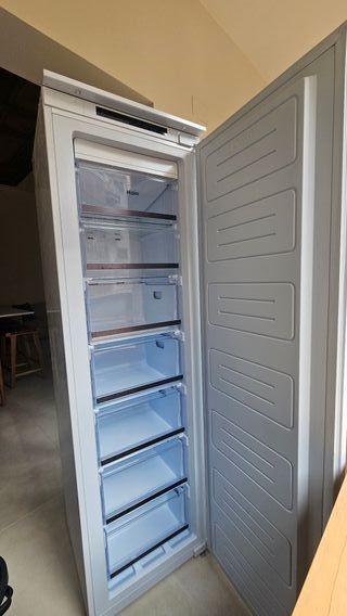 Congelador vertical Haier con poco uso, menos de 2 años. - Diseño moderno y funcional. - Múltiples cajones transparentes para fácil visualización. - Panel de control superior. - Tiene algunos rayones superficiales por el lado. - El congelador vino con una pequeña grieta que se ven en la ultima foto. Esto causa que despues de algunos meses hielo empiece a formar. Aparte de eso, funciona bien. Precio original: €850