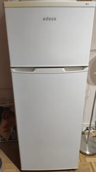 Frigorífico Edesa de color blanco y tamaño mediano. - Puertas independientes para frigorífico y congelador. - Cajón para fruta y verdura - Pequeños desperfectos estéticos en el lateral izquierdo y parte superior (mancha de óxido del microondas que tenía encima). Mejor dejar al aire y no cubrir para evitar condensación. - Hace un poco de hielo pero funciona perfectamente. Lo vendo porque lo hemos cambiado por uno más grande.