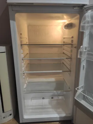 Nevera compacta pero espaciosa, perfecta para pisos pequeños, estudios o cocinas donde cada metro cuenta. Aunque no es grande, cabe perfectamente todo lo necesario para el día a día: comida, bebidas, fruta, verdura y congelados. Características: • Capacidad total: 95 L + congelador de 13 L (3 estrellas) • Congelador integrado (congela hasta 2 kg / 24 h) • 2 estantes de cristal regulables • Cajón para fruta y verdura • Estante en puerta para botellas grandes (hasta 1,5 L) • Temperatura regulable • Muy silenciosa (37 dB) • Patas regulables • Muy eficiente para su tamaño (clase energética D) Peso: 27 kg Muy poco uso y en excelente es