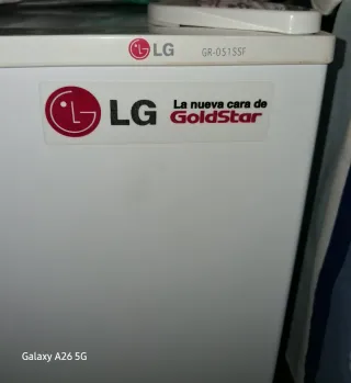 Frigorífico compacto de la marca LG, modelo GoldStar. Dimensiones aproximadas: 443 mm de ancho x 501 mm de alto x 450 mm de profundidad. Especificaciones técnicas: Funciona con un voltaje de 220-240 V. Capacidad de 48 a 50 litros. Tiene un cajón pequeño que es congelador. - Color blanco. - Diseño moderno y funcional.