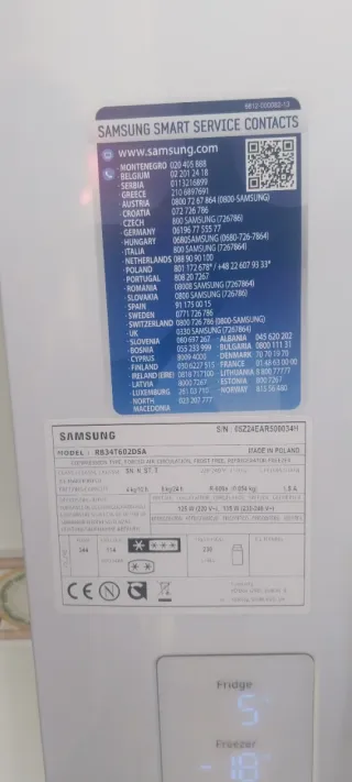 Comprada en 2024 con garantía ampliada de 3 años adicionales (demostrable con factura) GARANTÍA HASTA 2030 Datos técnicos: 📏 Dimensiones: 203 × 59.5 × 65.8 cm 📦 Capacidad total: 390 L Frigorífico: 276 L Congelador: 114 L 🔧 Tecnología principal No Frost (sin escarcha) All-Around Cooling: reparte el aire frío por todas las baldas Compresor Digital Inverter con garantía de fabricante de 20 años. SpaceMax: paredes más finas → más espacio interior Wi-Fi integrado para control con app Power Cool / Power Freeze para enfriar rápido bebidas o congelar rápido.