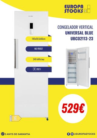 Congelador Vertical Universal Blue UBCO2113-23 - 282L Capacidad: 282 litros, ideal para grandes cantidades. Sistema: No Frost, sin escarcha y fácil mantenimiento. Eficiencia energética: Clase E, 249 kWh/año. Ruido: Silencioso, 41 dB. Funciones: Modo Super Freezer para congelación rápida. Diseño: Blanco, puerta reversible y luz LED. Dimensiones: 185 x 59,5 x 66 cm. Organización: Estantes y cajones prácticos.