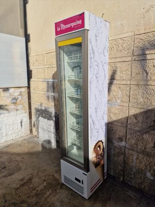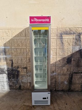 Armario de congelacion industrial estrecho con puerta de vidrio de segunda mano revisado y con garantia. Este exhibidor slim freezer mide 40 cm de largo por 48 de fondo y 187 de alto y resulta ideal para panaderia, pasteleria o bar restaurante, tanto para exponer el producto en barra como para cocina, pues asi antes de abrirlo pueden ver el producto que necesitan y asi que no pierda tanto frio. Tenemos toda clase de equipamiento de hostelería de ocasion, botellero, bajo mostrador, cocina industrial, horno, mesa fria, vitrina, mostrador.... llamanos ahora al 6/4/0/7/6/2/6/4/7 o visita nuestra nave, envios a toda la península.