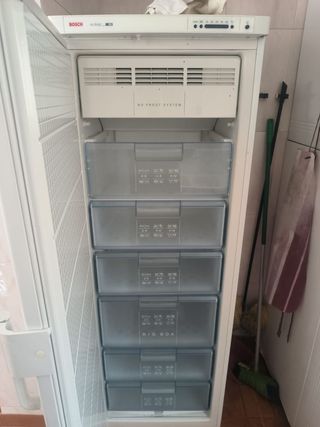 Congelador vertical NO FROST de color blanco, con varios cajones transparentes.ya tiene sus años y tiene marcas de uso pero funciona perfectamente congela hasta menos 24 grados puesto hasta hace unos días le falta un cajón.no hace hielo ni escarcha.cajones amplios - Diseño vertical. - Cajones transparentes.