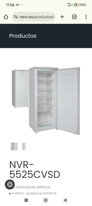 Congelador vertical de la marca Nevir, modelo NVR-5525CVSD. Ideal para mantener tus alimentos congelados. - Diseño blanco. - Puerta laminada interior. - Cajones transparentes para fácil visualización. Lo vendemos porque no tiene "No Frost" y eventualmente hay que quitar el hielo en la parte de arriba (espátula) Fue comprado en Electrodomesticos Rivero, Santander. Está dentro de garantía y tiene un garantía extra de 2 años.