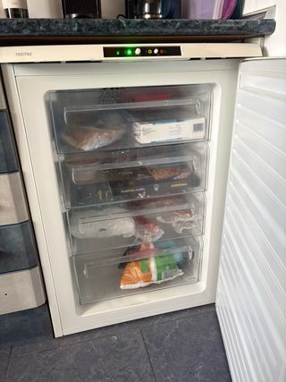 Funciona perfectamente, congela muy bien. Es No No-Frost, por lo que con el tiempo puede hacer algo de hielo en las paredes (funcionamiento normal). Ha estado un tiempo cerrado sin usarse, por eso tiene un poco de moho superficial interior, nada estructural ni de funcionamiento. Es solo de limpieza/ventilación. Con cajones amplios y compartimento Fast Freeze. Ideal como congelador principal o auxiliar (garaje, trastero, segunda residencia). Estado general bueno y 100% funcional. Recogida en mano, medidas aproximadas.
