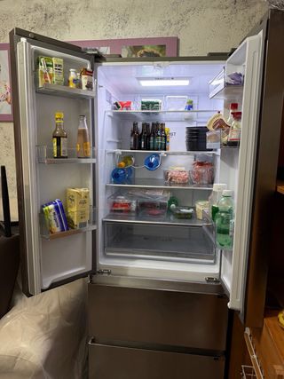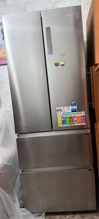 Frigorífico Haier con sistema French Door, elegante y funcional. Gran capacidad. - Diseño moderno en acero inoxidable. - Amplio espacio interior. - Cajones inferiores para congeladora Hace un año que lo compre y lo cambio porque cambió la cocina y no me cabe. Lo compré por 900 porque llevaba un golpe en la parte superior derecha , muy pequeño.