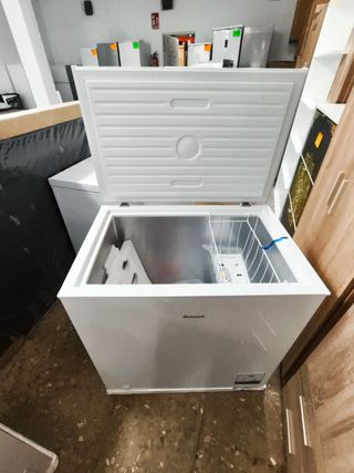 Congelador horizontal de la marca Hisense en color blanco. - Diseño moderno y funcional. - Asa integrada para fácil apertura. - Control de temperatura. - Etiqueta informativa con funciones.