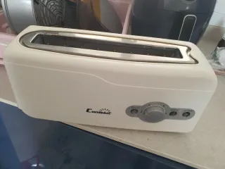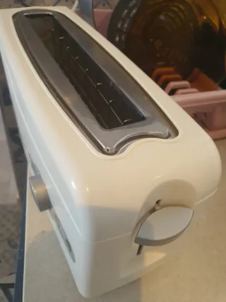 Tostadora de diseño alargado en color blanco. Cuenta con varios niveles de tostado y funciones adicionales. - Ranura larga para diferentes tipos de pan. - Selector de nivel de tostado (1-5). - Botón de parada. - Función de recalentar. - Función para pan congelado.