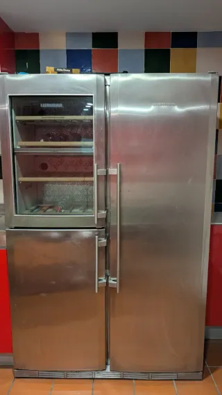 Frigorífico de gran capacidad de la prestigiosa marca alemana Liebherr, modelo de alta gama en acabado de acero inoxidable antihuellas. destaca por combinar tres funciones clave en un solo mueble: Vinoteca Integrada (Vinidor): Compartimento exclusivo con puerta de cristal para la conservación óptima de vinos a diferentes temperaturas. Congelador NoFrost: Tecnología que evita la formación de hielo, eliminando la necesidad de descongelar manualmente. Frigorífico de Gran Capacidad: Con tecnología BioFresh para mantener frutas, verduras, carnes y lácteos frescos por mucho más tiempo.