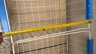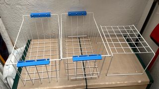 Conjunto de cestas de alambre blanco, diseñadas para congeladores tipo arca. Incluyen soportes azules para su fijación. - Material: Alambre blanco. - Color de los soportes: Azul. - Diseño: Malla. - Cantidad: 2cestas (2 profundas) y 1 separador largo 46 ancho 21,5 profundidad 24