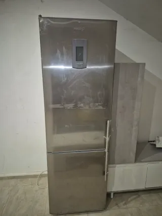 Frigorífico de 1,90 metros de altura. Con fallo de no enfriar, el motor suena el display funciina pero no enfria nada en ninguna oarte. Presenta un diseño moderno en acabado metálico. - Panel de control digital en la parte superior. - Tirador metálico en la puerta. - Dos puertas, una para el frigorífico y otra para el congelador.