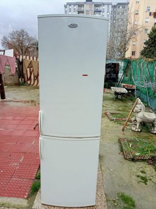 Nevera de la marca Whirlpool en muy buen estado. Es un electrodoméstico de dos puertas, una para el congelador y otra para el frigorífico. - Color blanco. - Puertas con tiradores. - Logo de la marca en la parte superior.