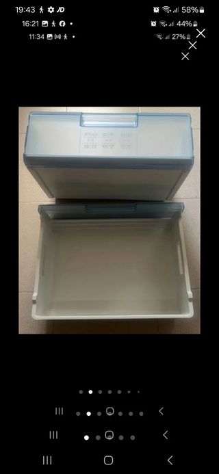 Cajón del congelador, tengo el primero y el segundo del frigorífico bosch de 2 metros o 2 y poco, estan perfectos. Dispongo de los 2 primeros, sus medidas son las mismas uno de medidas 34.5 con reborde de fondo y de ancho 45,5 cm y de altura del cajón 13.5 cm y altura de la parte frontal 17 cm, tambien tengo el último en un azul un pelin más claro, el de los hielos le tengo también 47x28.5.Precio unitario. Deja nuevo tu frigorífico....No regateos gracias