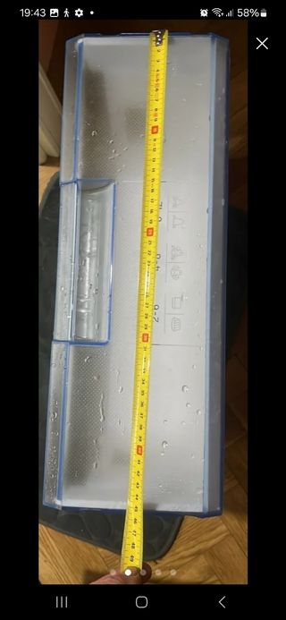 Cajón del congelador, tengo el primero y el segundo del frigorífico bosch de 2 metros o 2 y poco, estan perfectos. Dispongo de los 2 primeros, sus medidas son las mismas uno de medidas 34.5 con reborde de fondo y de ancho 45,5 cm y de altura del cajón 13.5 cm y altura de la parte frontal 17 cm, tambien tengo el último en un azul un pelin más claro, el de los hielos le tengo también 47x28.5.Precio unitario. Deja nuevo tu frigorífico....