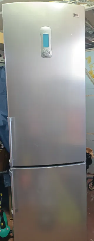 Frigorífico combi LG de color plateado. - Diseño moderno con pantalla digital. - Tirador lateral integrado. No funciona bien la parte de refrigeración. Falla un ventilador, el congelador funciona. Para arreglar o accesorios / recambios. Medidas: 200x66,5x59,5