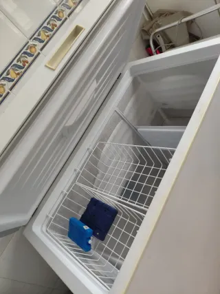 Arcón congelador de la marca Menorquina. - Diseño blanco con detalles de colores en la parte inferior. - funciona perfectamente. Pero hace hielo.