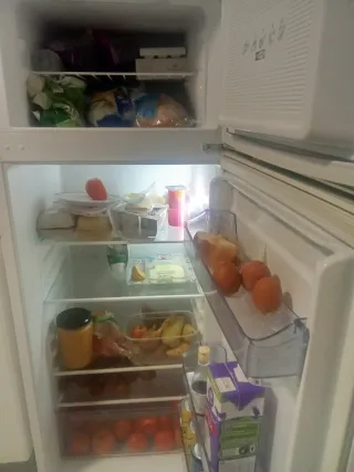 Nevera blanca con congelador superior. -144 cm de alto por 55 de ancho. - No se hacen envíos. - Estantes interiores. - Cajones para verduras. - Puerta con compartimentos.