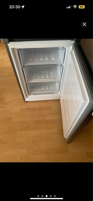 Nevera de la marca Sharp en color plateado. Cuenta con dos puertas y un diseño moderno. - Puerta superior para congelador. - Puerta inferior para refrigerador. - Tiradores integrados. -Se regala un microondas. - Se tiene que venir a recoger -Se encuentra en Santa Maria d’Oló