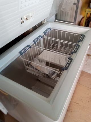 Congelador horizontal marca danesa Vestfrost, modelo SB 200, perfecto estado de funcionamiento, muy bien cuidado. -198 litros. -Luz y termómetro en el interior. -2 compartimentos, 2 cestas amovibles. -Temperatura regulable, congelación rápida. -Muy silencioso, alta eficiencia. -Blanco / tapa gris claro. -92.5 (ancho) × 63 × 83.5 cm. -Ideal para uso doméstico o profesional (hostelería, comercio). -Actualmente se comercializa por 800€ nuevo. Listo para enchufar y usar. *Pequeño roce lateral y llave extraviada (nunca utilizada). No afecta al funcionamiento. -Recogida sólo en persona. 10 placas congelación de regalo.
