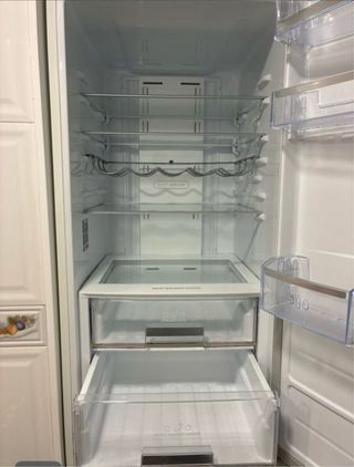 Nueva, tengo factura y es de octubre de 2025, es de libre instalacion y la compre sin saberlo, por lo que se ha estropeado Error E1, el radiador, habria que cambiarlo, lo tengo enclaustrado por eso paso el fallo. Nueva sin un solo golpe ni nada, esta perfecta Haier HTW5620CNMG - Frigorífico combi con cajones 205 x 59.5 x 66.7 cm Frigorífico combi Haier con cajones. Diseño moderno en acabado plateado. - Cajones inferiores para congelador. - Panel de control integrado.