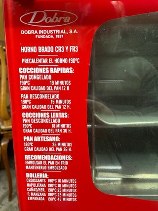 Horno de la marca Dobra, modelo CR3 y FR3. Diseñado para cocinar como un horno de leña, en seco y sin vapores. - Precalentamiento rápido. - Cocciones rápidas y lentas. - Recomendaciones para pan artesano y pizzas. - Indicaciones para cocciones de masa congelada. Nota: 2 de las 4 bandejas hay que limpiarlas. - Modelo: CR3 y FR3 - Marca: Dobra - Tipo de cocción: Seco y sin vapores Sólo recogida.
