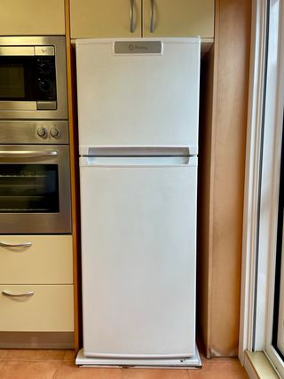 Nevera de estilo retro de la marca New Pol. Su diseño vintage le da un toque especial a cualquier cocina. - Color blanco crema. - Tiradores cromados. - Compartimento congelador superior.