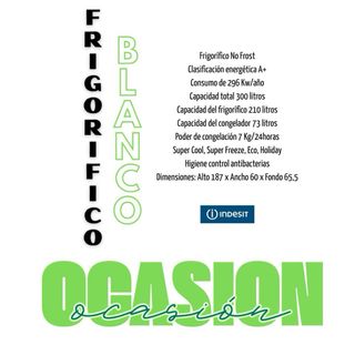 PRODUCTO DE OCASION. SOLICITAR FOTOS REALES Y ESTADO DEL PRODUCTO A NUESTRO CONTACTO 664688014 659500057 Productos de OUTLET y OCASION sólo se sirven en la Comunidad de Madrid, resto de productos se envían a toda España (península) Frigorífico No Frost Clasificación energética A+ Consumo de 296 Kw/año Capacidad total 300 litros Capacidad del frigorífico 210 litros Capacidad del congelador 73 litros Poder de congelación 7 Kg/24horas Super Cool, Super Freeze, Eco, Holiday Higiene control antibacterias Dimensiones: Alto 187 x Ancho 60 x Fondo 65,5