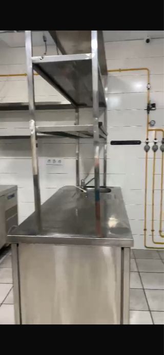 Mesa de frío para cocina profesional con seis puertas, fregadero integrado y estantería sobre encimera ( 3 baldas ) Ideal para optimizar el espacio y la organización en tu negocio. Se puede poner en forma de isla o península. - Construcción robusta en acero inoxidable. - Seis puertas para almacenamiento. - Fregadero de fácil limpieza.