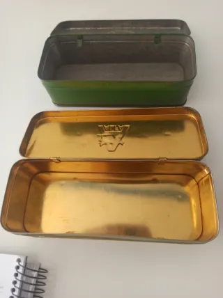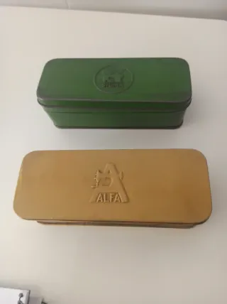 Dos cajitas metálicas vintage, una verde con el logo de Sigma y otra dorada con el logo de Alfa. - Caja verde con logo Sigma. - Caja dorada con logo Alfa.