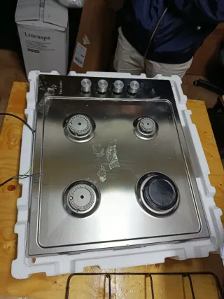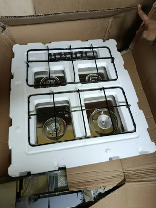 Cocina a gas con acabado en acero inoxidable. Se puede adaptar para usar con gas butano o gas natural. - Encimera de acero inoxidable. - Parrillas de hierro fundido.