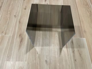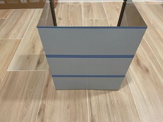 Mostrador vitrina con estructura de metal y cristal. - Ideal para exhibir productos en tu negocio. - Diseño moderno con acabados en azul y blanco. - Base con ruedas para fácil movilidad.