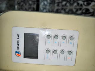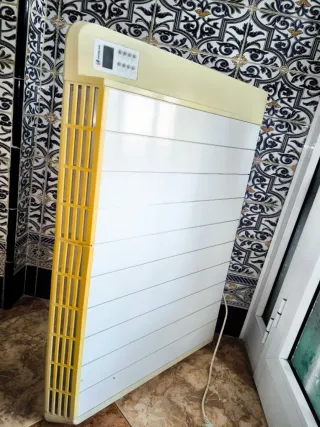Radiador de pared Haverlamd con panel de control digital. - Diseño moderno en color blanco y amarillo. - Panel de control con pantalla digital y botones. - Rejillas laterales de ventilación.