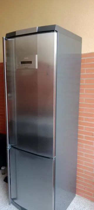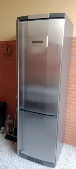 Frigorífico de la marca AEG con un diseño moderno y acabado en acero inoxidable. Presenta leves imperfecciones. - Acabado en acero inoxidable. - Panel de control digital.