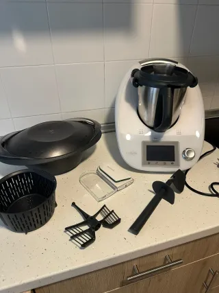 Se vende robot de cocina Thermomix TM5 en color blanco. Incluye varios accesorios para facilitar la preparación de tus comidas. Se ha usado poco pese a tener ya varios años, como único desperfecto destacable, el cable se quemó un poco (captura 4) pero todo funciona perfectamente. Se vende porque no se le da uso. Todos los accesorios están en bastante buen estado, tiene lo del cookidoo pero sin suscripción activa. Ofertas absurdas serán ignoradas, me reservo el derecho a hacer trato con quien quiera, si tú perfil tiene pocos votos o me parece poco fiable, no envío por Wallapop. Preferencia absoluta a la venta en mano.