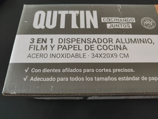 Dispongo a la venta este práctico cortador de papel film. Es de color gris plata y está en buen estado. - Ideal para guardar rollos de papel film o similar. - Fabricado en plástico resistente. - Diseño compacto y fácil de usar.