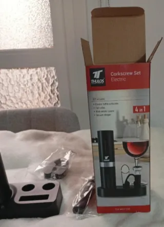 Set de sacacorchos eléctrico Thulos. - Sacacorchos eléctrico para botellas. - Cortador de papel de aluminio. - Aireador y vertedor de vino. - Tapón de vacío.