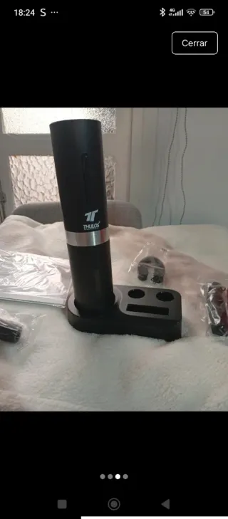 Vendo sacacorchos eléctrico Cuisinart, en buen estado. Es negro y plateado, con base de carga. - Abre botellas de vino de forma rápida y sencilla. - Incluye cortador de papel de aluminio. - Funciona con batería recargable.