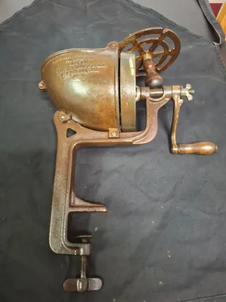 Máquina antigua para cortar verduras, con patente de 1900. Fabricada en hierro fundido, presenta un diseño robusto y funcional. - Mecanismo de manivela. - Base con abrazadera para fijar a mesa. - Detalles de época.