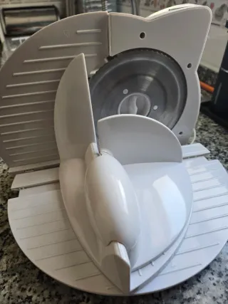 Cortador de fiambre plegable en color blanco. Ideal para preparar tus propios embutidos y alimentos. - Cuchilla de corte. - Bandeja de alimentación. - Base estable.