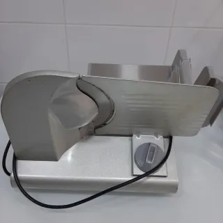 Se vende cortadora eléctrica de fiambre y alimentos de uso doméstico, en muy buen estado y totalmente funcional. Ideal para cortar embutidos, queso, pan o verduras con precisión. • Cuchilla circular de acero inoxidable • Regulador de grosor con escala visible • Motor eléctrico con selector • Carro deslizante con empujador de seguridad • Protector de cuchilla • Base plegable para fácil almacenaje • Color gris • Incluye todos los accesorios originales Funcionamiento correcto, sin defectos.