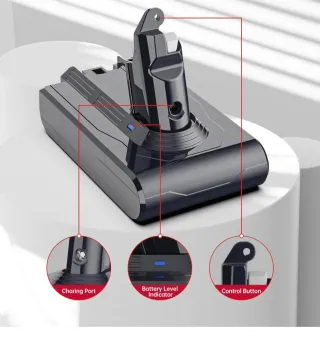 Batería de repuesto para aspiradoras Dyson V6. Diseño en color gris oscuro. - Indicador de nivel de batería. - Puerto de carga. - Botón de control.