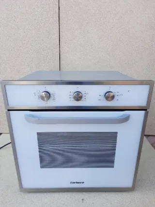 Horno de cocina de la marca Corbero en color blanco con ventilador - Diseño moderno con frontal de cristal. - Panel de control con mandos giratorios. - Puerta con ventana y rejilla. - Asa metálica. - Acabado en blanco.