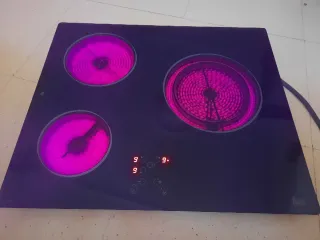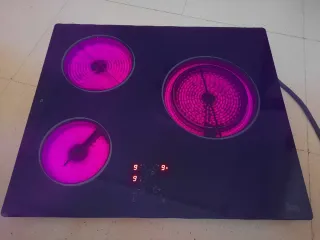 Placa vitrocerámica de la marca Teka con tres zonas de calor. - Diseño moderno en color negro. - Mandos táctiles. - Indicadores digitales de potencia. Funciona correctamente