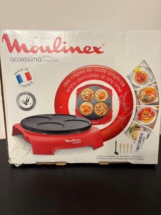 Crepera Moulinex Accessimo Crep'Party para hacer crepes y tortitas. Moulinex PY312511, Crepera Accessimo Placa Prometal con Revestimiento Antiadherente, 720 W, Capacidad de 4 creps, 4 Espátulas y cucharón incluidos, Fácil uso, Almacenamiento vertical, Color Rojo - Incluye 4 espátulas y una cuchara medidora. - Fabricada en Francia.