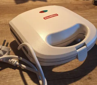 Nueva sin uso Crepera eléctrica con mango blanco y detalles rojos. Incluye cable de alimentación. - Superficie de cocción negra. - Mango ergonómico.